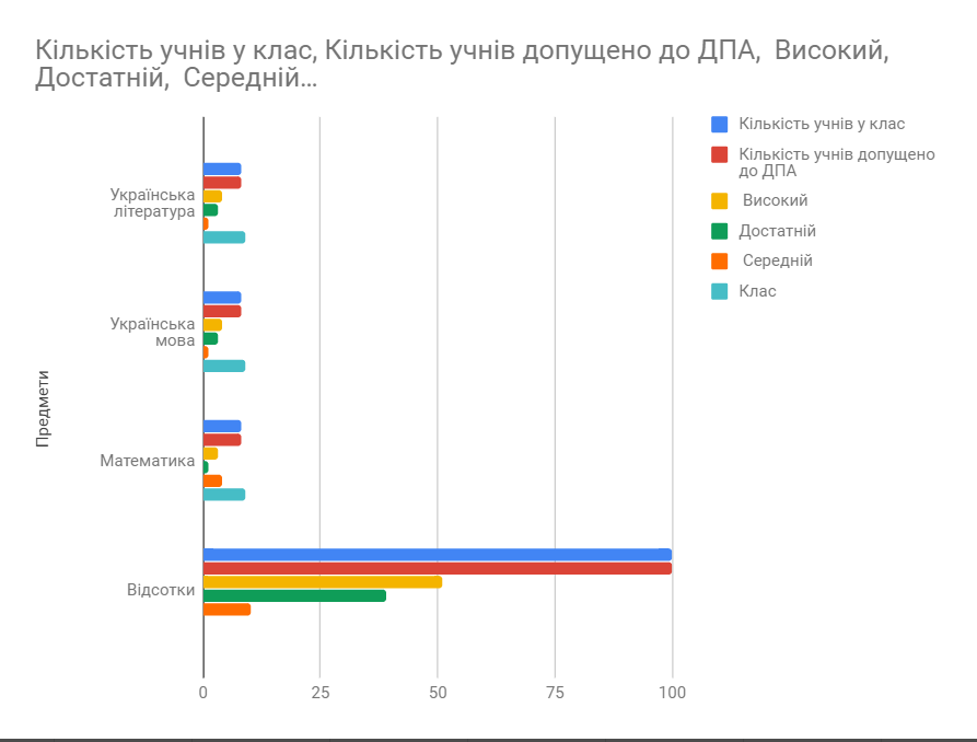 - 9 клас (українська мова, математика, українська література) – 8 учнів - 100%